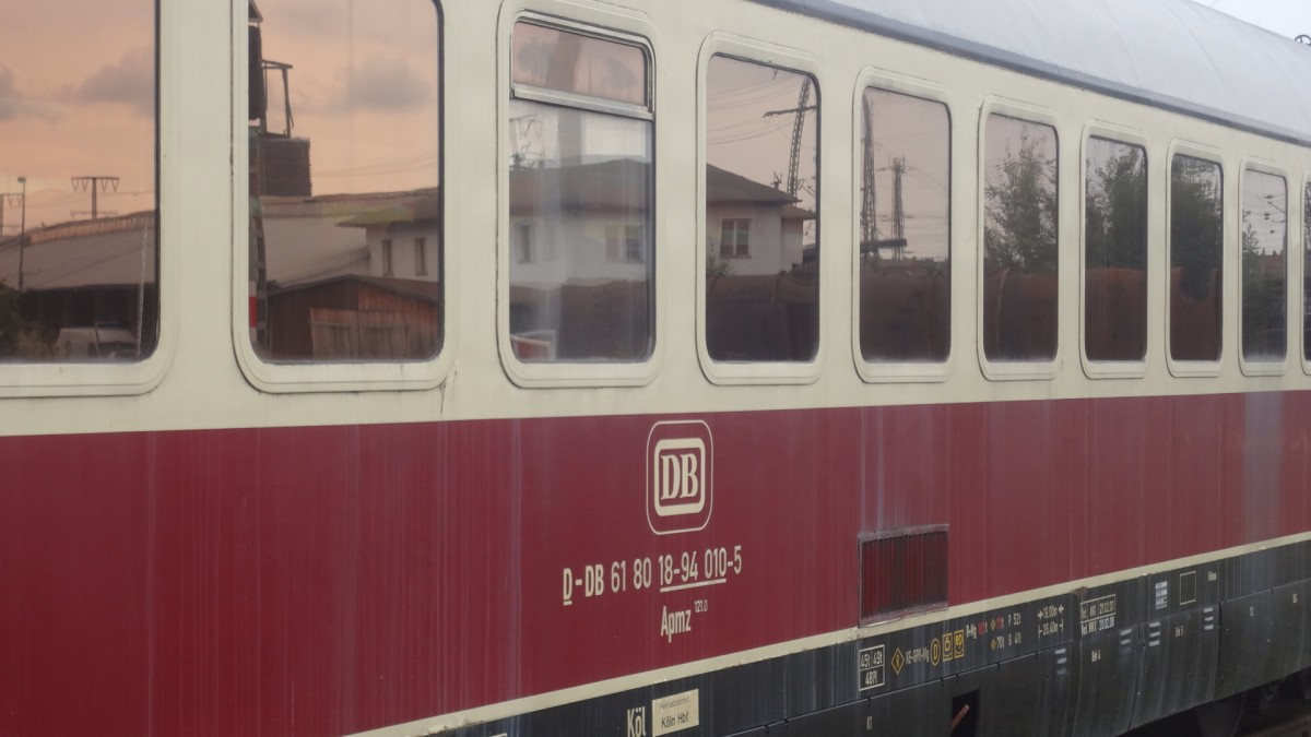 31.7.2014 Cheb / Eger. Hab nicht schlecht gestaunt zu sehen, dass meine Bank auch Reisezugwagen least. (Wg-Nr: 61 54 19 - 7004 - 7 Aee)