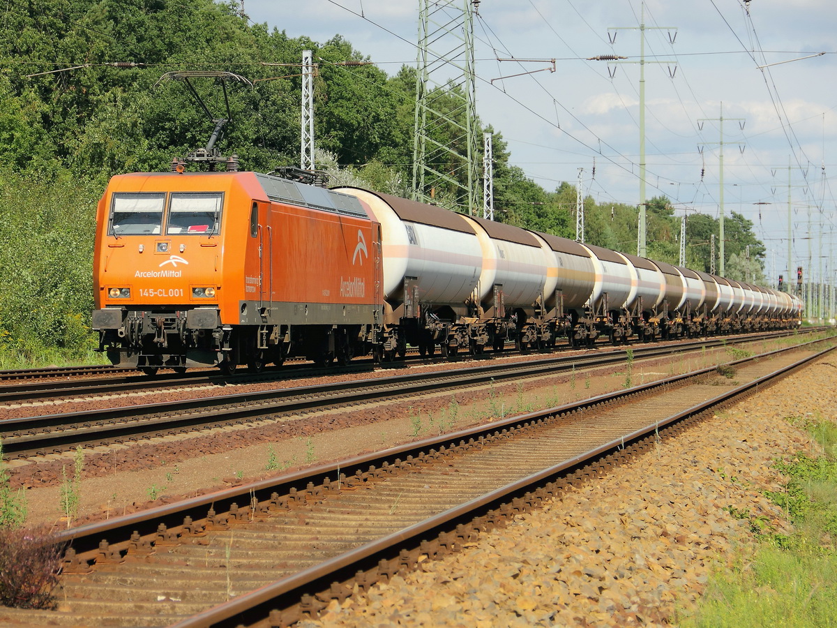 Die durch die HGK von der EKO Trans gemietete 145-CL001 (145 501) mit einem Kesselzug am 31. Juli 201 aus Richtung Berlin kommend auf dem südlichen Berliner Außenring in Höhe Diedersdorf. EKO Trans hat die 145-CL001 von HML gemietet