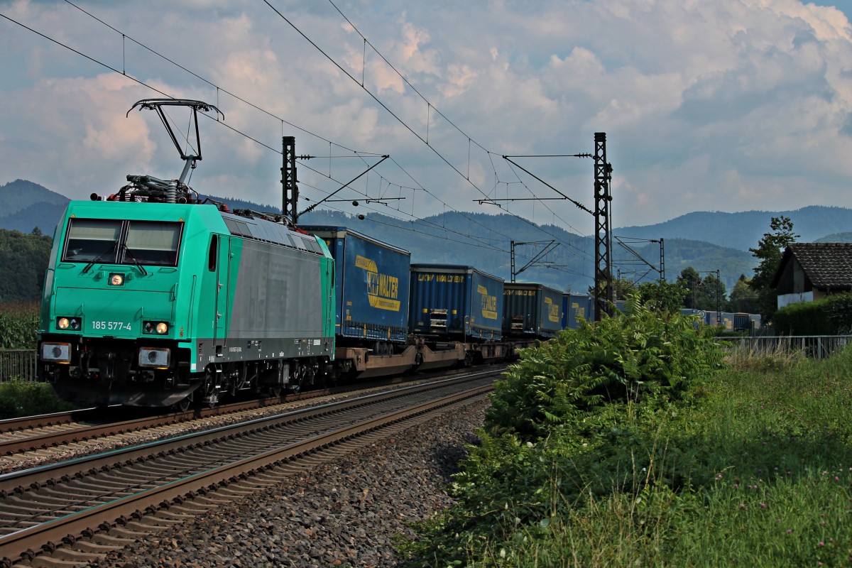 Ebenfalls am 01.08.2014, die frisch revidirte 185 577-4 von Alpha Trains/Crossrail mit einem  LKW Walter  Containerug beim Hp Kollmarsreute in Fahrtrichtung Norden. Nachdem die Lok auch bei ihrer HU gewaschen wurde, sind wieder die Stellen an der Seitenwand zu erkennen, wo früher mal BLS Cargo und LTE Logos mal geklebt haben.