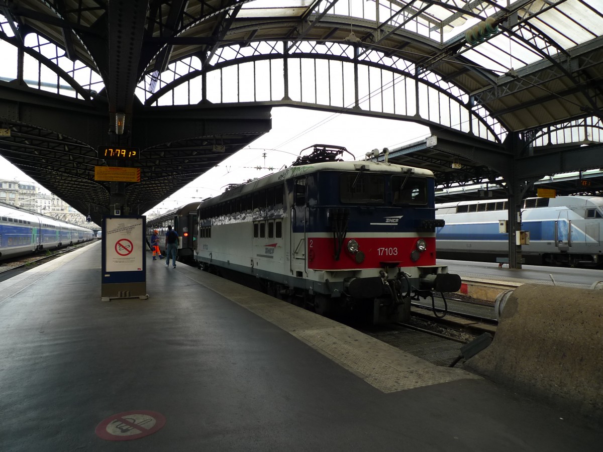 SNCF-BB7603 mit Doppelstockwendezug in den Beton-Katakomben des Bahnhofs Paris-Montparnasse. Als Ersatz für noch ältere Fahrzeuge wurden von der SNCF 14 Lokomotiven der Reihe BB7200 für den Transilien-RER Vorortverkehr in Paris umgebaut (u.a. Heizkabel, Tür- und Wendezugsteuerung) und in die neue Reihe BB 7600 umgezeichnet und umlackiert.