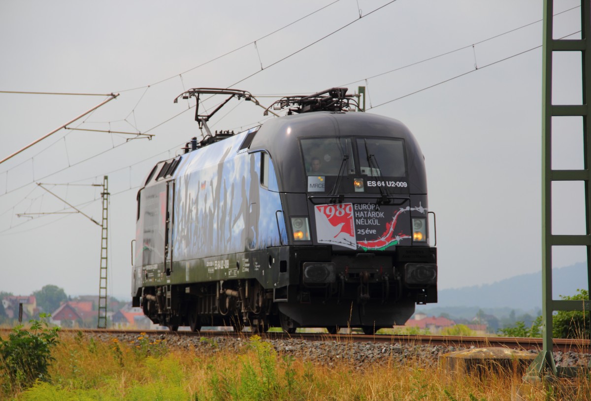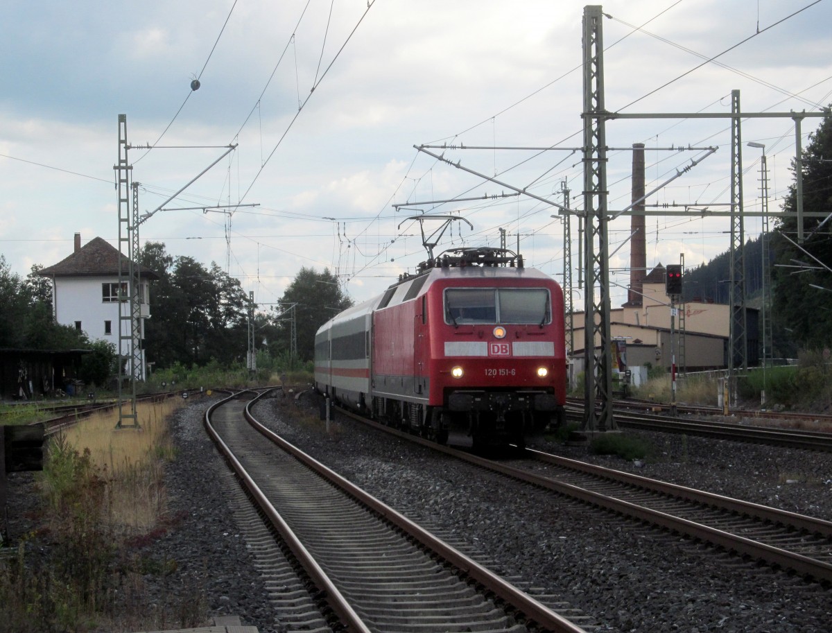 120 151-6 zieht am 03. August 2014 den ICE 1104 durch Kronach in Richtung Saalfeld.