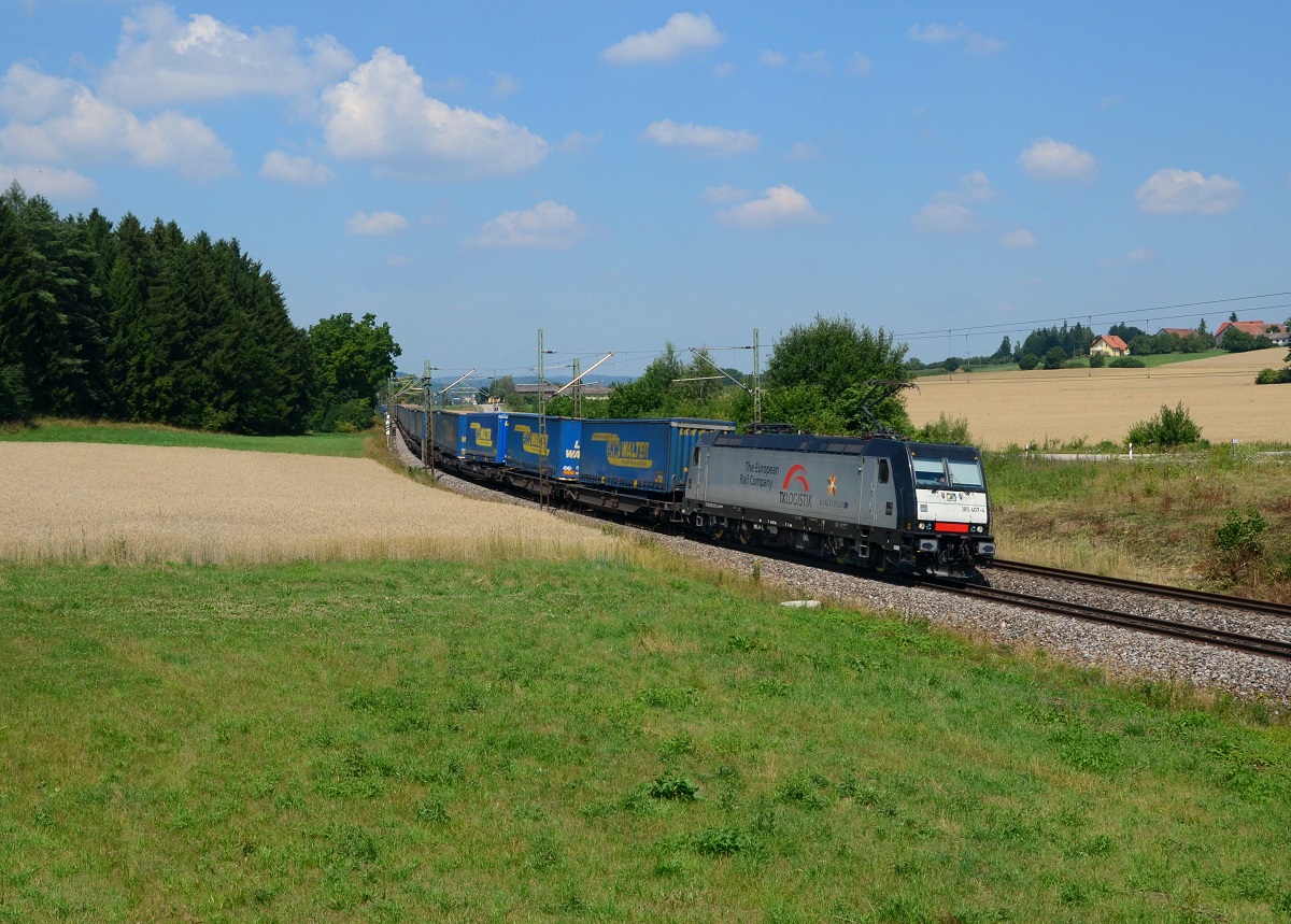 Die 185 681-4 am 02.08.14 von Rail Pool vor einem Kesselwagenzug bei Übersee am Chiemsee.