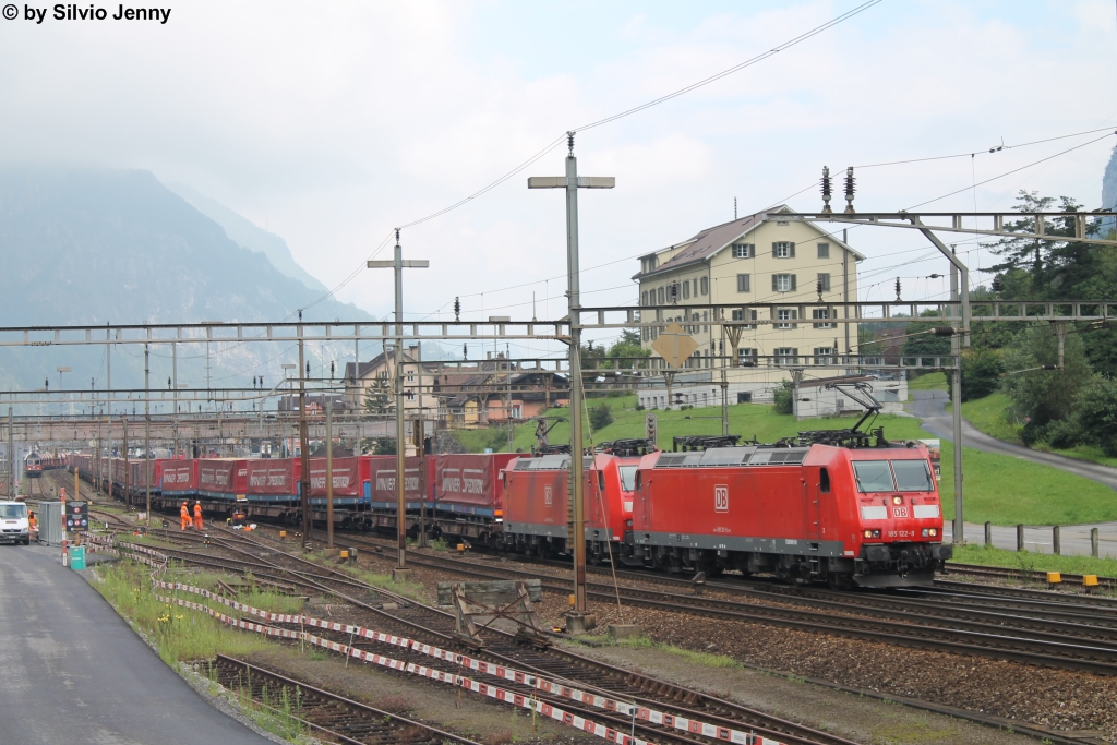 BR 185 122-9 und 185 136-9 sowie die nicht sichtbare Schiebelok 185 134-4 verlassen am 31.7.2014 Erstfeld mit dem Winner-Zug in Richtung Süden.