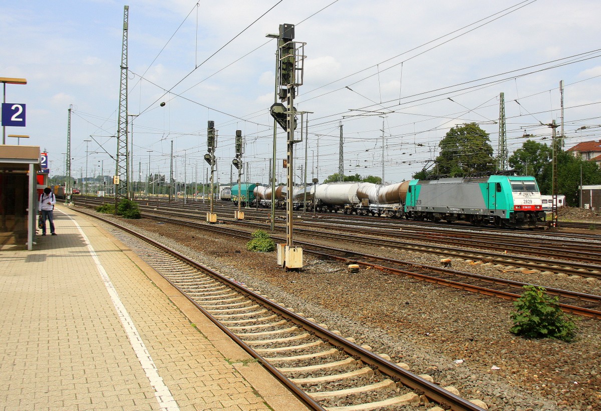 Die Cobra 2829 fährt mit einem kurzen gemischten Güterzug aus Antwerpen-Noord(B) nach Köln-Gremberg bei der Ausfahrt aus Aachen-West und fährt in Richtung Aachen-Schanz,Aachen-Hbf,Köln. Aufgenommen vom Bahnsteig in Aachen-West bei Sonne und Wolken am Mittag vom 4.8.2014.