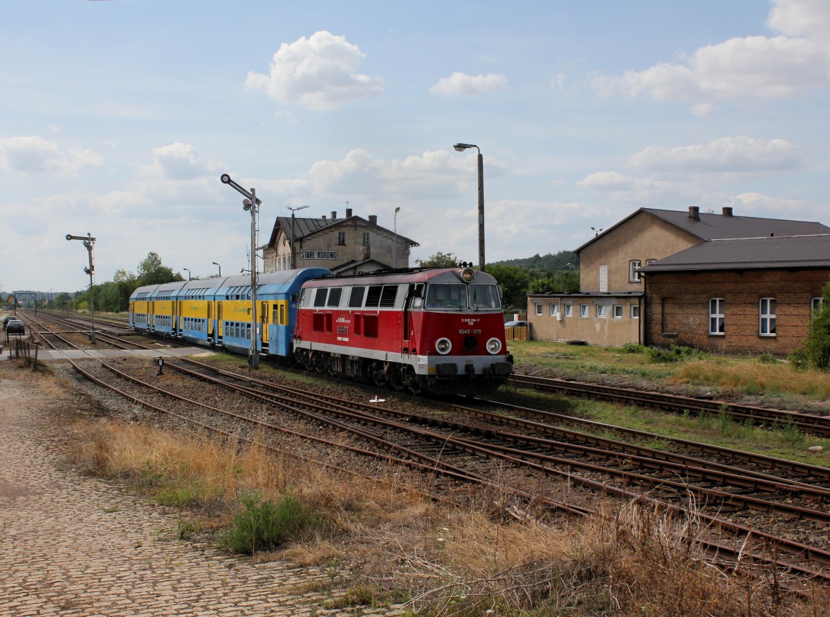 Die SU 45-079 mit einem R nach Krzyż am 01.08.2014 bei der Ausfahrt aus  Stare Kurowo.