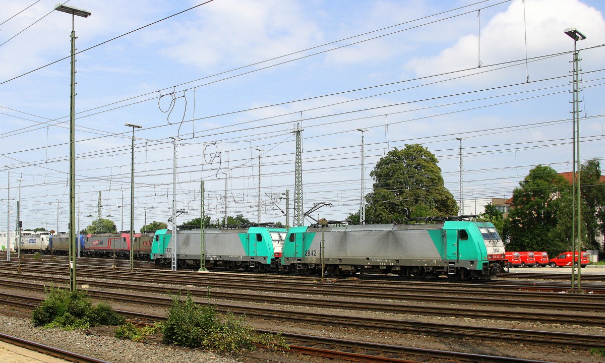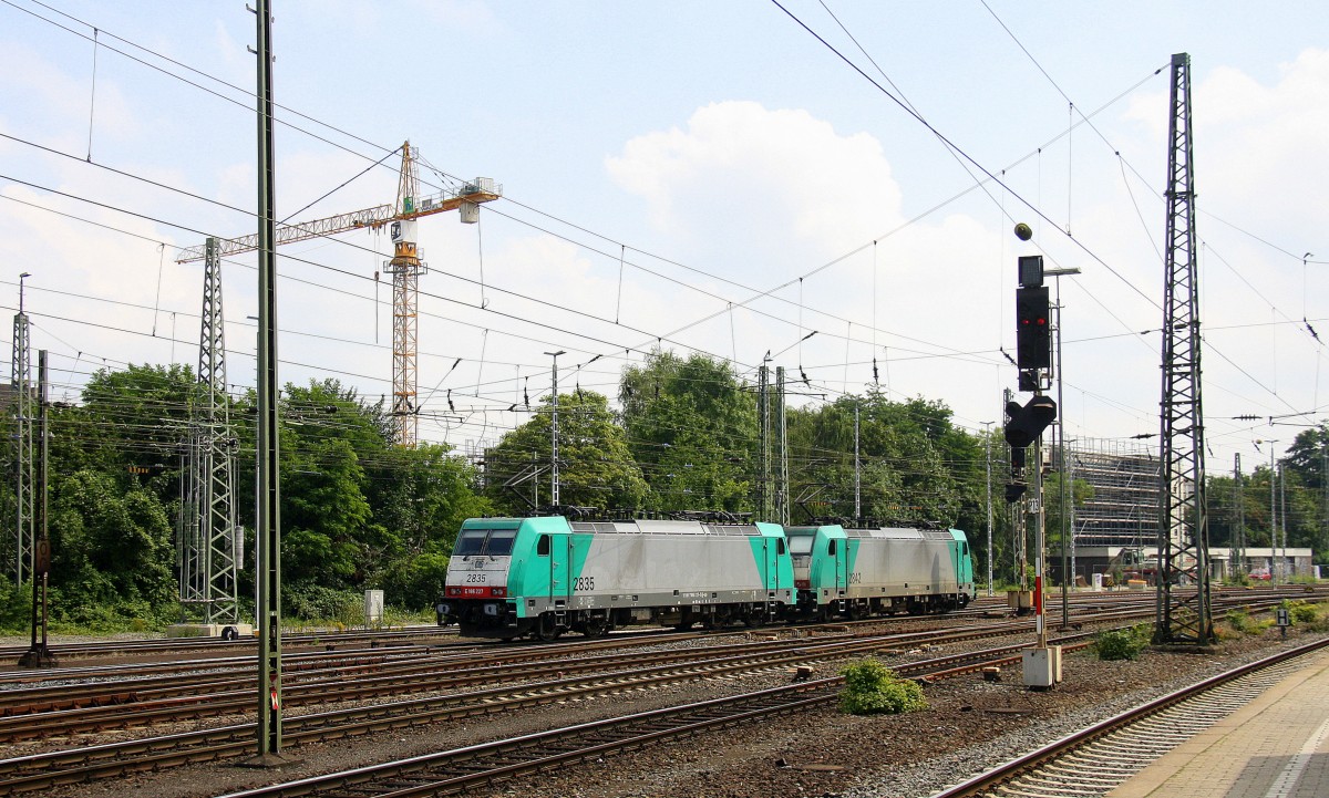 Ein Nachschuss von Zwei Cobra 2835 und 2842 fahren als Lokzug aus Aacen-West in Richtung Montzen/Belgien. Aufgenommen vom Bahnsteig in Aachen-West bei Sonne und Wolken am Mittag vom 4.8.2014.