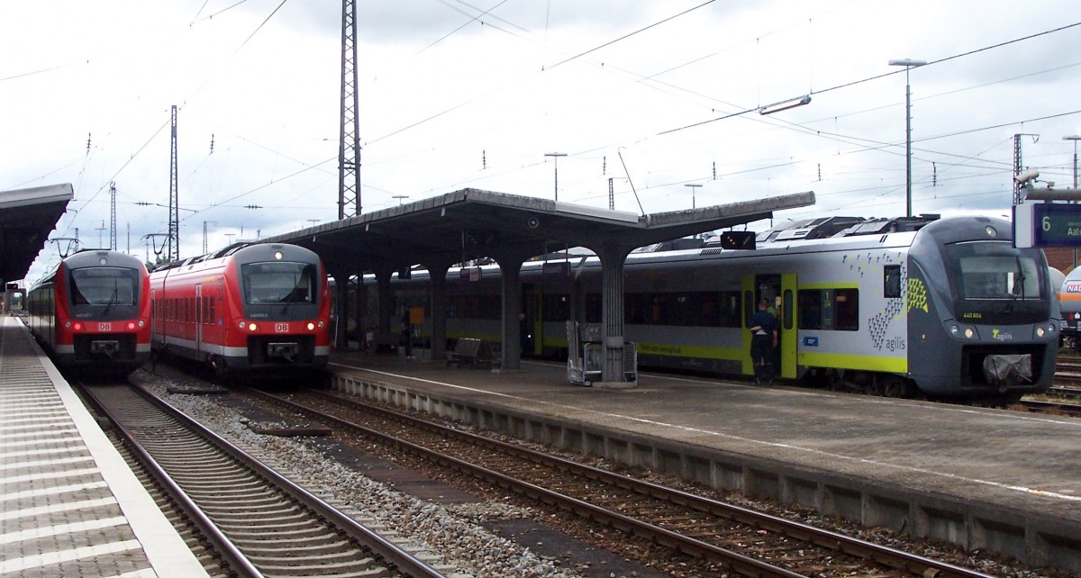 Mittags in Donauwörth: Immer einige Minuten vor der vollen Stunde füllt sich der Bahnhof mit Triebzügen BR 440,bis zu 5 Stück,  hier 440 003 der DB und AGILIS 440 604 am selben Bahnsteig, ganz links DB 440 027. Wenige Minuten später zerstreut sich die Ansammlung wieder in alle Winde und Ruhe kehrt ein - dank Taktfahrplan.