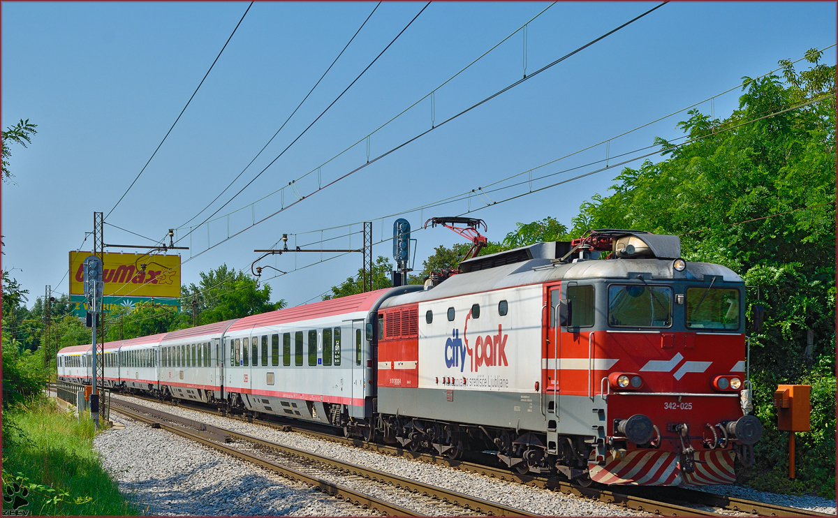 SŽ 342-025 zieht EC158 'Croatia' durch Maribor-Tabor Richtung Wien. /18.7.2014