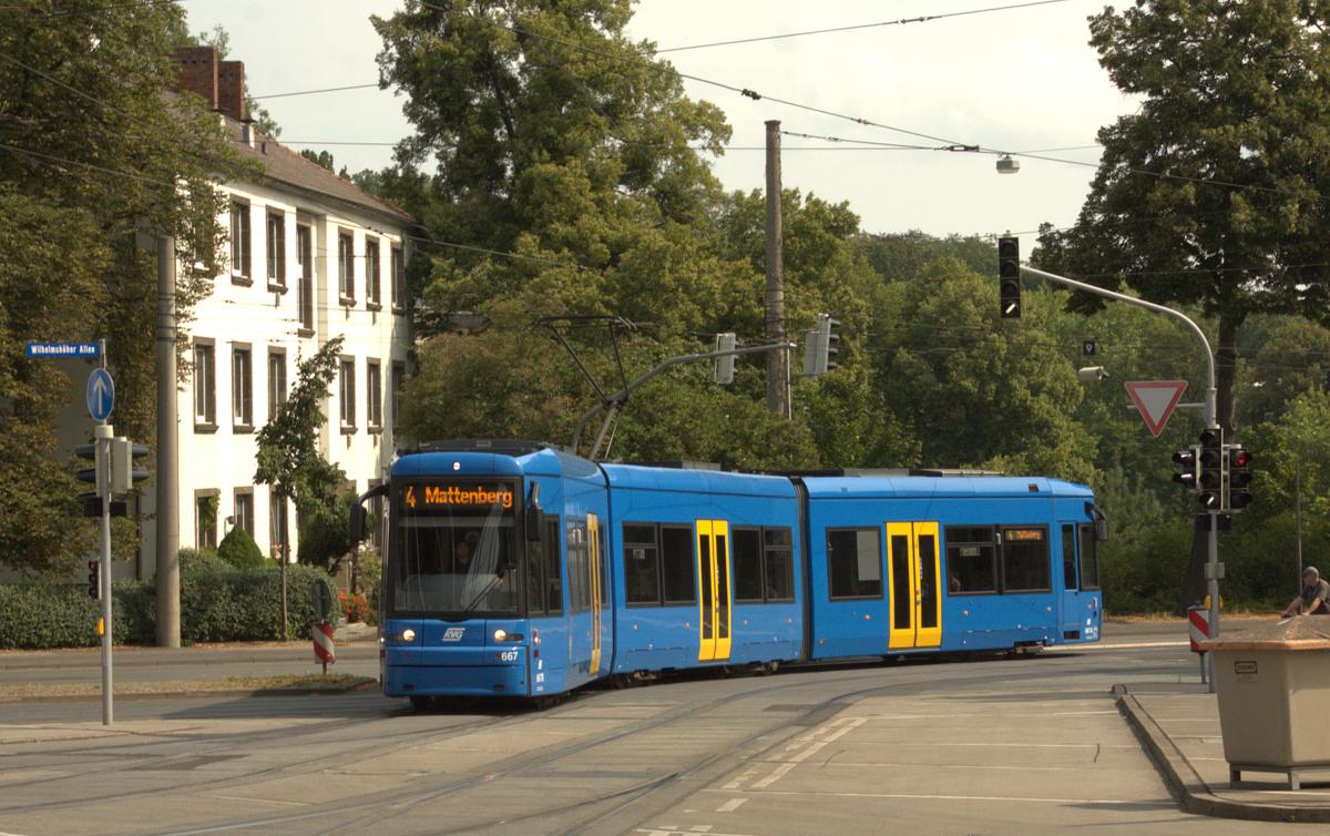 Tram Wagen 664 der KVG erreicht auf der Linie 4 fahrend am 2.8.2014 um 11.15 Uhr den Bahnhof Kassel Wilhelmshöhe.