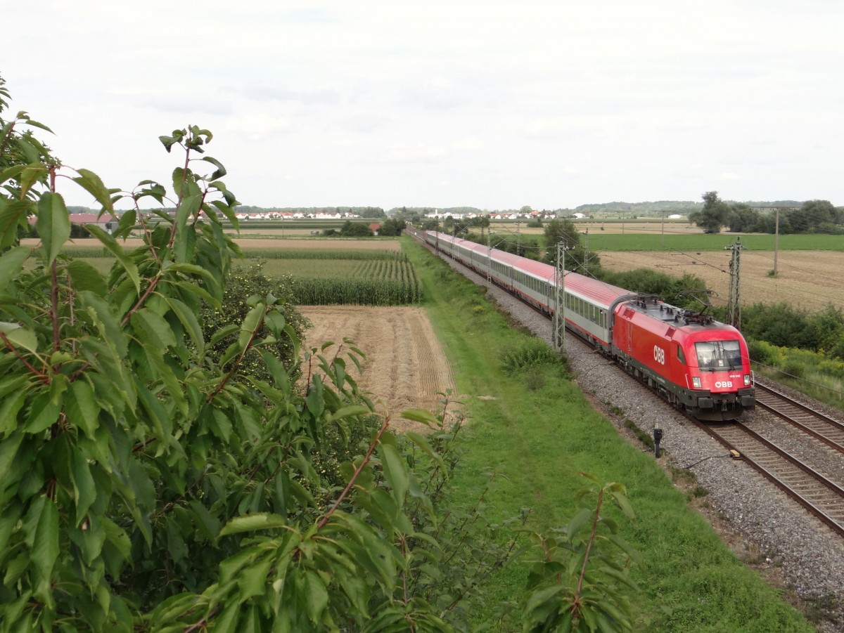 Bei der Apfelwiese am Eichberg, fährt 1144.071 mit EC-158 am 9.8.14 talwärts.