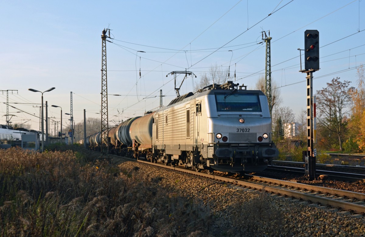37032 zog am 22.11.14 einen Kesselwagenzug durch Leipzig-Thekla Richtung Schönefeld.