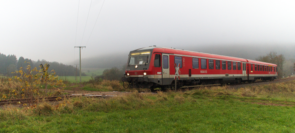 MORA C hat auch hier viele Güterkunden vom Bahntransport abgehängt, ein Werk von Hörmann in Freisen war ein guter Güterkunde. 628 452 hat die Steigung von Türkismühle her erklommen und passiert nun den ehemaligen Bahnhof in Nohfelden Süd.