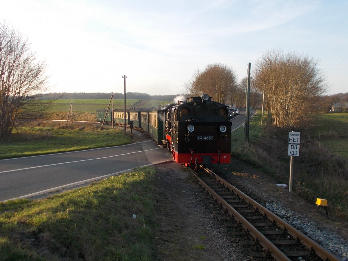 Am 29.November 2014 überquerte die,sonst in Grün lackierte,99 4633(Mh53),mit ihren Zug nach Göhren,den Bahnübergang an der B196 bei Serams.
