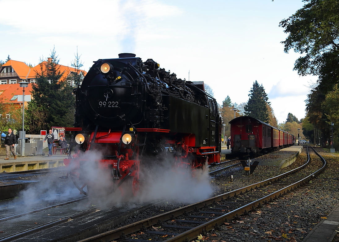 Am Mittag des 17.10.2014 rangiert 99 222 hier gerade im Bahnhof Drei Annen Hohne an P8920 aus Nordhausen heran, welchen sie kurz darauf zum Brocken bringen wird.