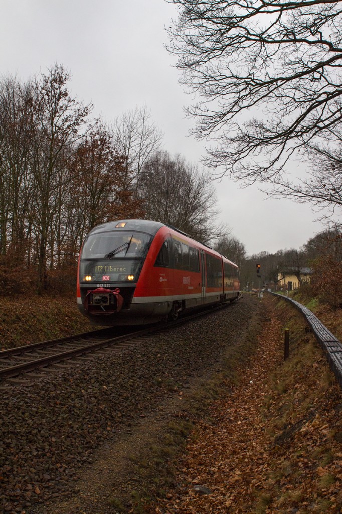 Am trüben 07.12.14 wurde der 642 535-9 als RE2 nach Liberec bei Bischofswerda im Bild festgehalten.