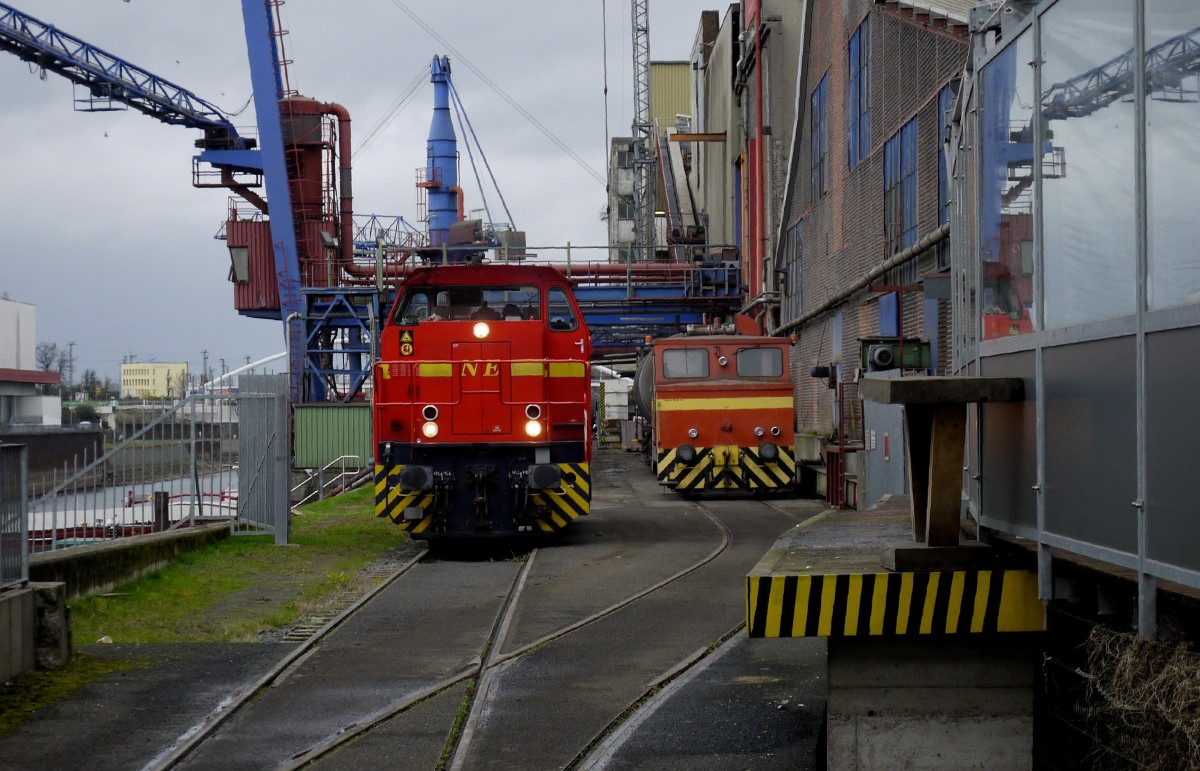 Einer der beiden Windhoff-Rangierroboter, die sich seit Jahren im Eigentum der Neusser Eisenbahn befinden. Am 11.12.14 steht er auf einem Nebengleis am Hafenbecken V des Neusser Hafens. Das Bild wurde vom Wendersplatz aus aufgenommen.