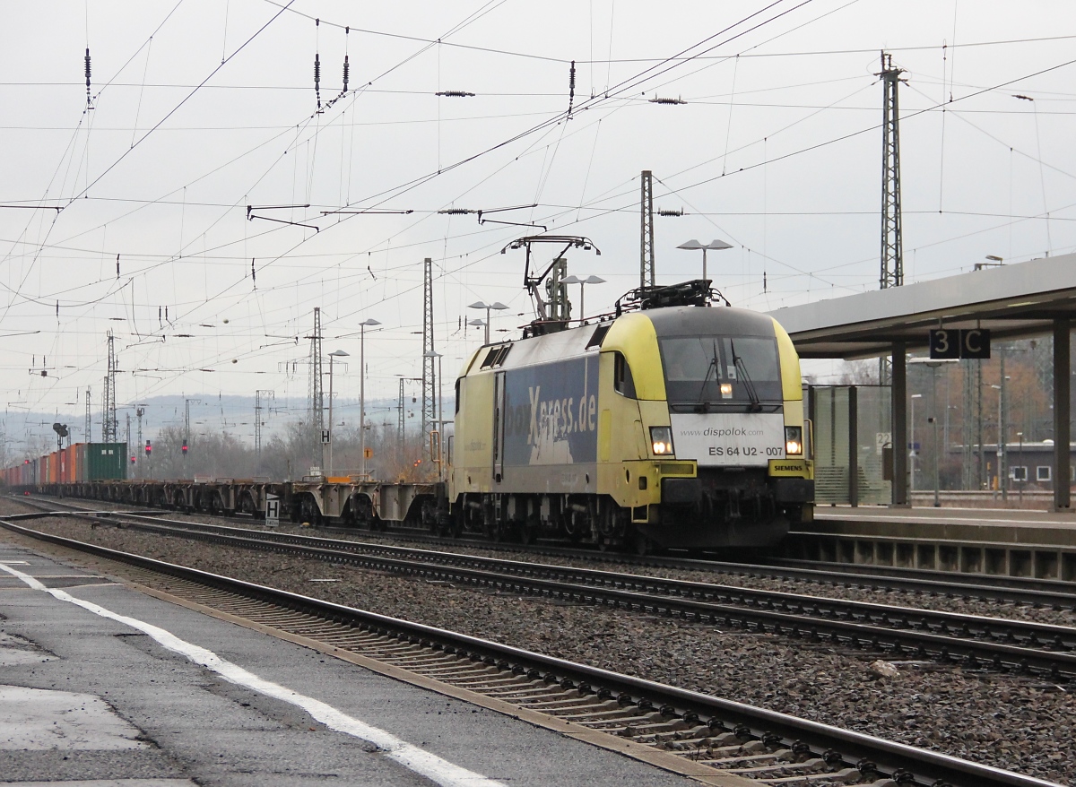 182 507 (ES 64 U2-007) mit Containerzug in Fahrtrichtung Süden. Aufgenommen in Eichenberg am 19.12.2013.