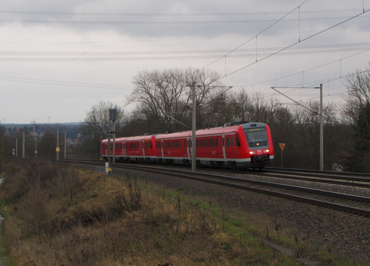 Der RE 3658 von Glauchau (Sachs) nach Göttingen, am 10.12.2014 bei Erfurt Bischleben.