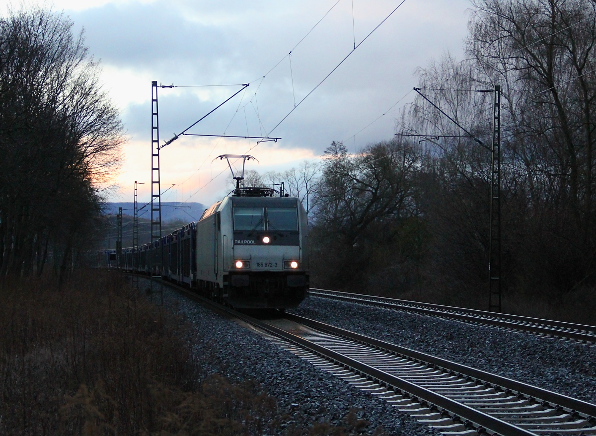 Das letzte Bild vom Jahr 2013 zweigt 185 672-3, die leere Autotransportwagen in Richtung Süden durch Wehretal-Reichensachsen zieht. Aufgenommen am 29.12.2013.