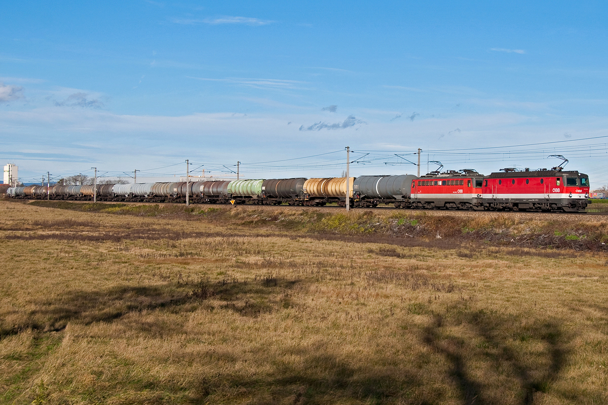 1144 272 und eine BR 1142 bringen einen Kesselwagengganzzug Richtung Osten. Die Aufnahm entstand am 19.12.2014 kurz nach Himberg.