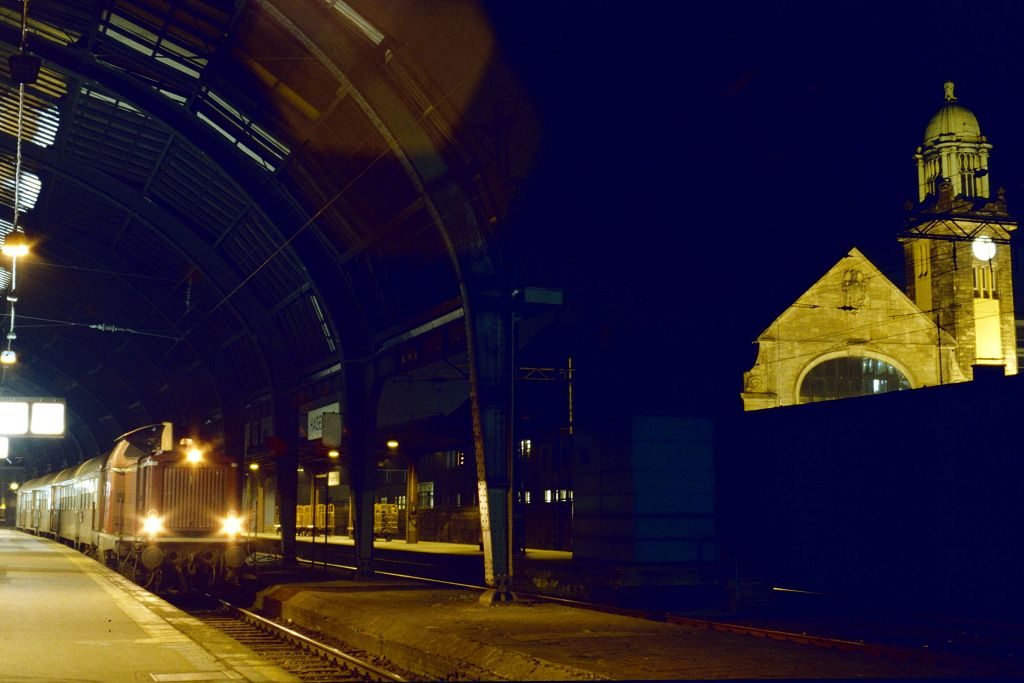 212 308 in Hagen Hbf. mit Empfangsgebäude, Februar 1987