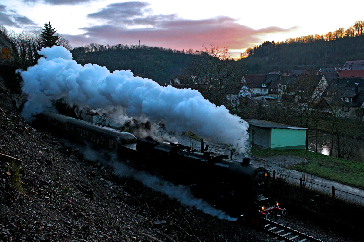 Eigentlich verbietet sich eine Dampflok im Gegenlicht. Doch manchmal ergeben sich interessante Einblicke. 52 7596 vor der Primtalbrücke bei Rottweil. Dezember 2014.