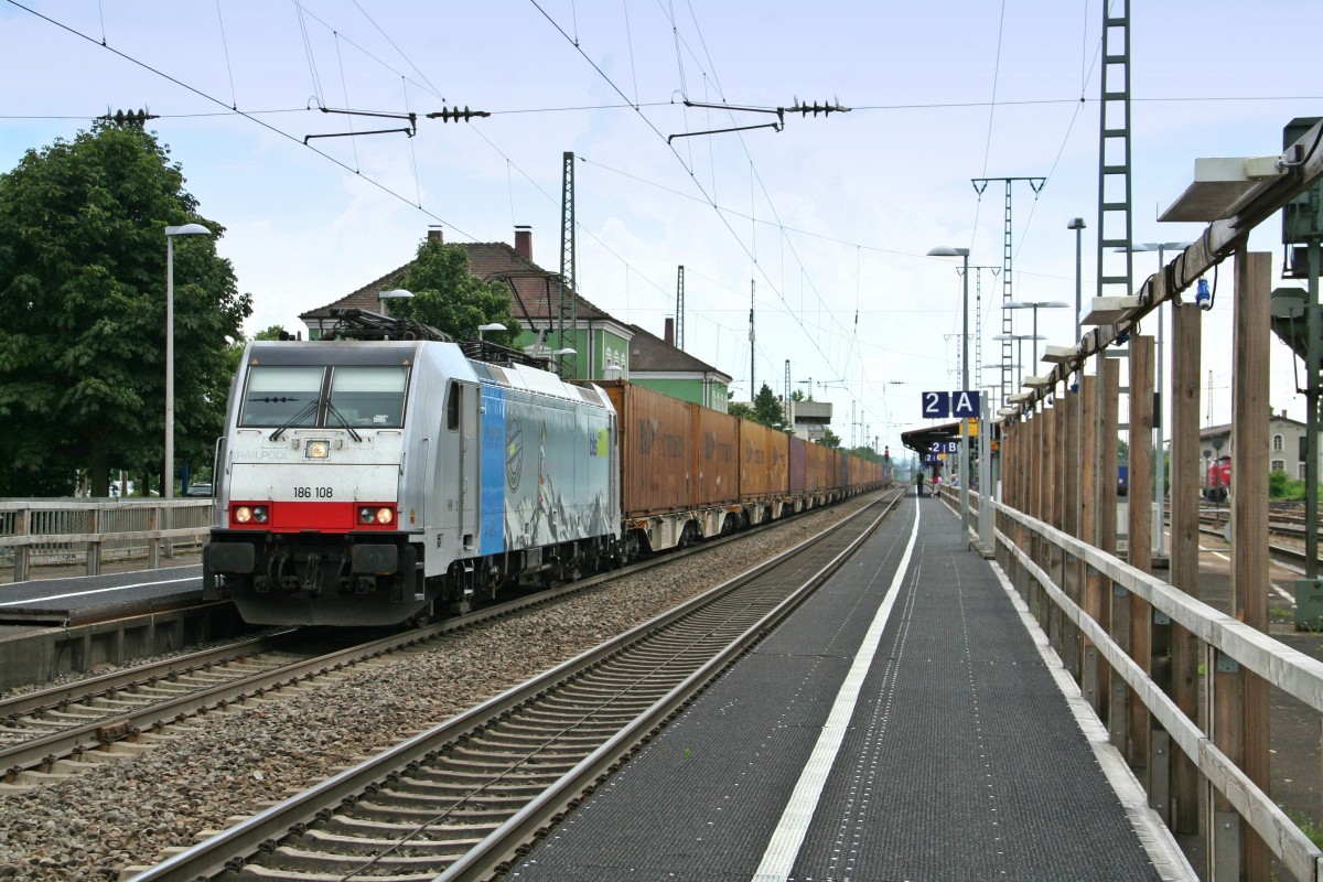 186 108 mit einem KLV-Zug aus Italien in Richtung Venlo am Nachmittag des 23.07.14 in Müllheim (Baden).
