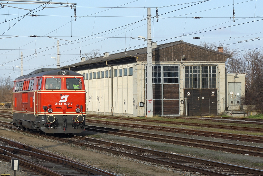 NLB 2143 070-7 am 21.Dezember 2014 neben dem Lokschuppen im Bf. Laa a.d. Thaya beim Wenden vom SR 14292 auf SR 14293.