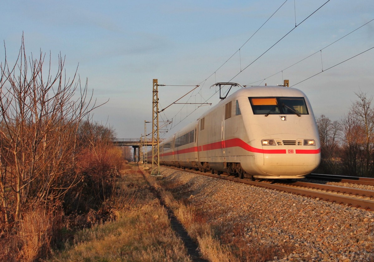 Dieses Bild vom 11/08/2009 zeigt einen deutschen ICE Bruxelles-Midi - Frankfurt auf der kürzlich freigegebenen neuen Hochgeschwindigkeitsstrecke zwischen Lüttich und Aachen, hier bei Astenet kurz vor der Einmündung auf die alte Strecke.