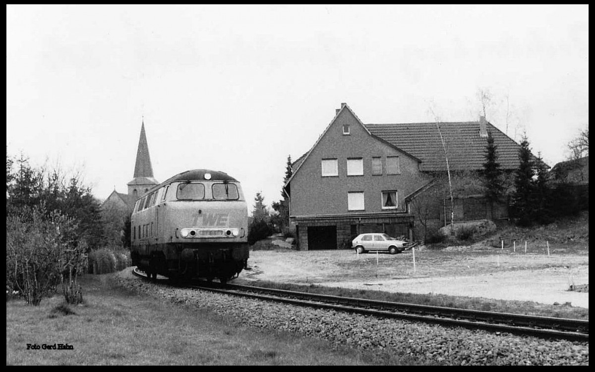 Lollo V 160 der TWE kehrt von einem der seltenen Einsätze zum Hafen Dörenthe zurück und fährt hier am 12.5.1989 durch Tecklenburg - Brochterbeck.