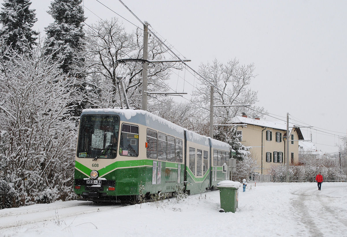 Tw.608 fährt die Stenggstraße zwischen den Haltestellen Mariagrün und Kroisbach stadtauswärts. (28.12.2014)