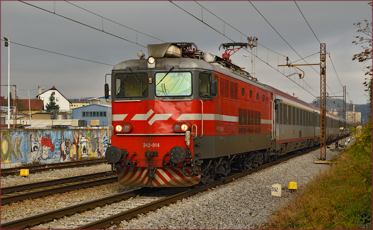 SŽ 342-014 zieht EC151 'Emona' durch Maribor-Tabor Richtung Ljubljana. /17.11.2014