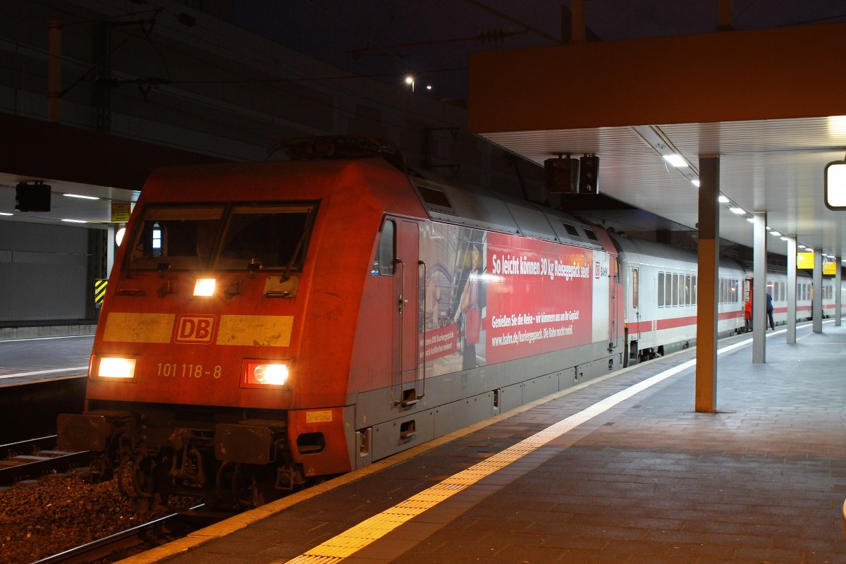 101 118 am 21.12.13 mit einem IC beim Halt in Düsseldorf Hbf.