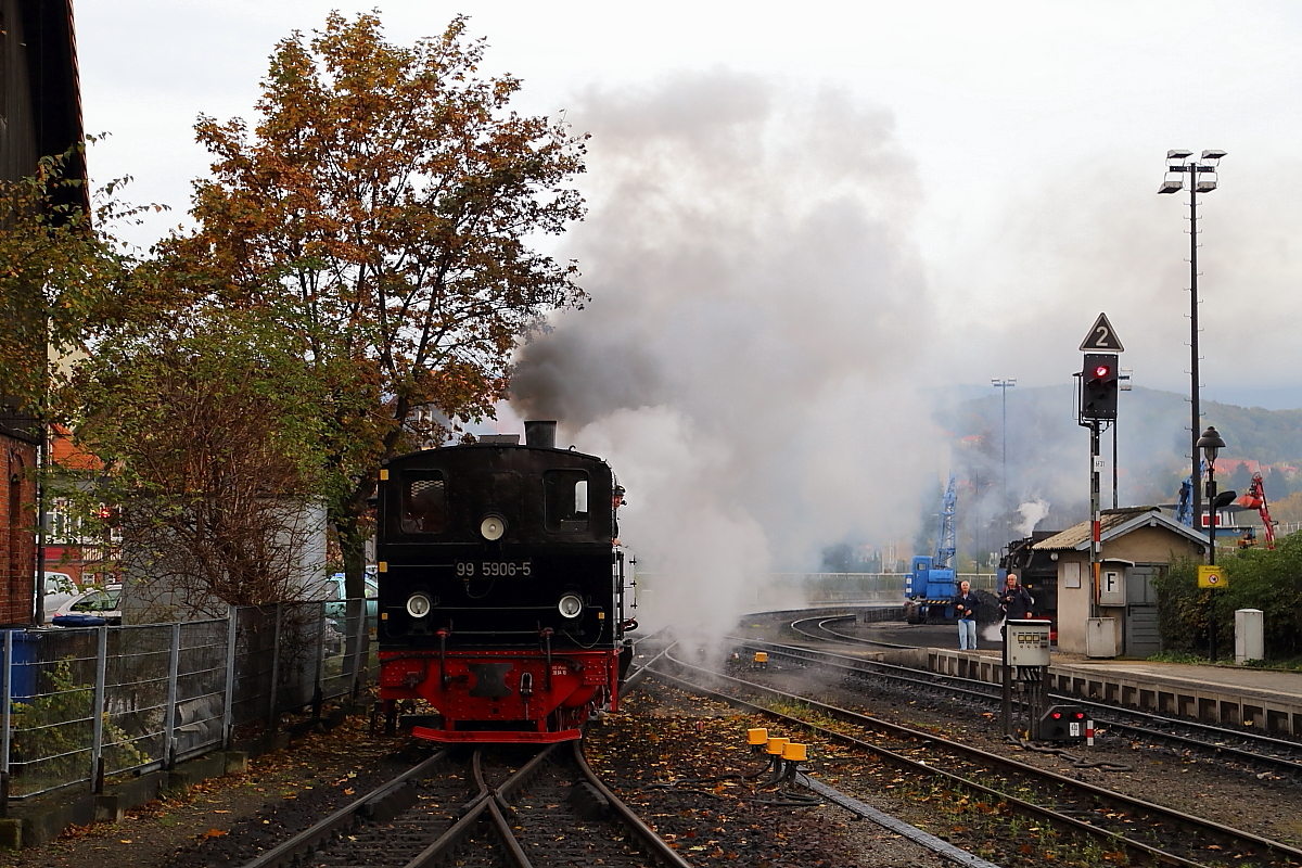 99 5906 am Morgen des 17.10.2014 bei der Einfahrt auf Gleis 34 im Bahnhof Wernigerode. Sie wird in wenigen Augenblicken an einen Sonderzug der IG HSB ankuppeln.