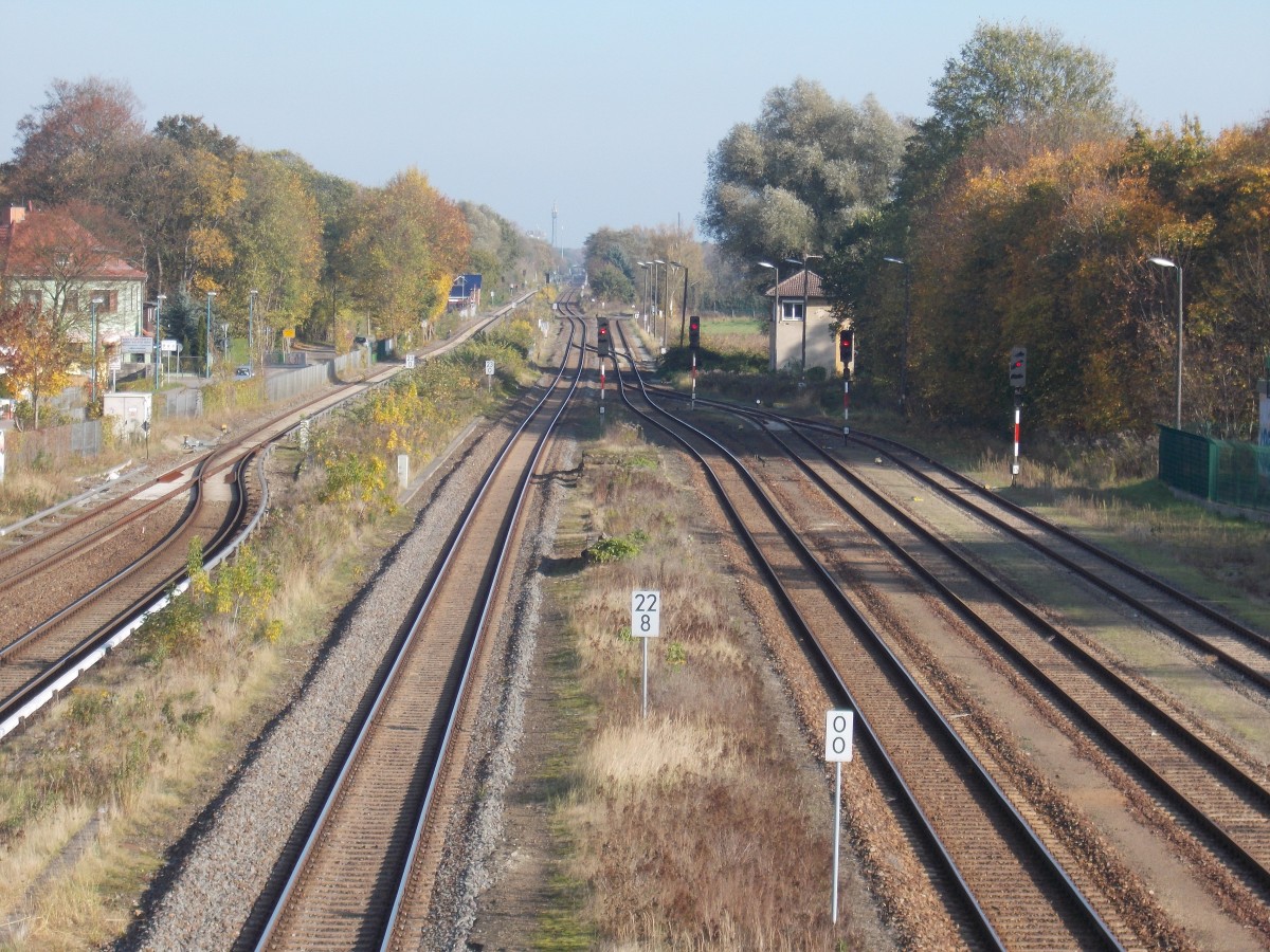 Der Ausfahrbereich in Fredersdorf Richtung Strausberg am 27.Oktober 2014.Hinter den Ausfahrsignale ist die abzweigende Anschlußstrecke zum Zementwerk Rüdersdorf zuerkennen.