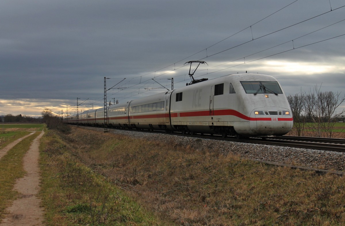 Am 03.01.2014 fuhr 401 063-3 westlich vom Winzerörtchen Hügelheim vorbei als ICE 279 (Berlin Ostbahnhof - Basel SBB).