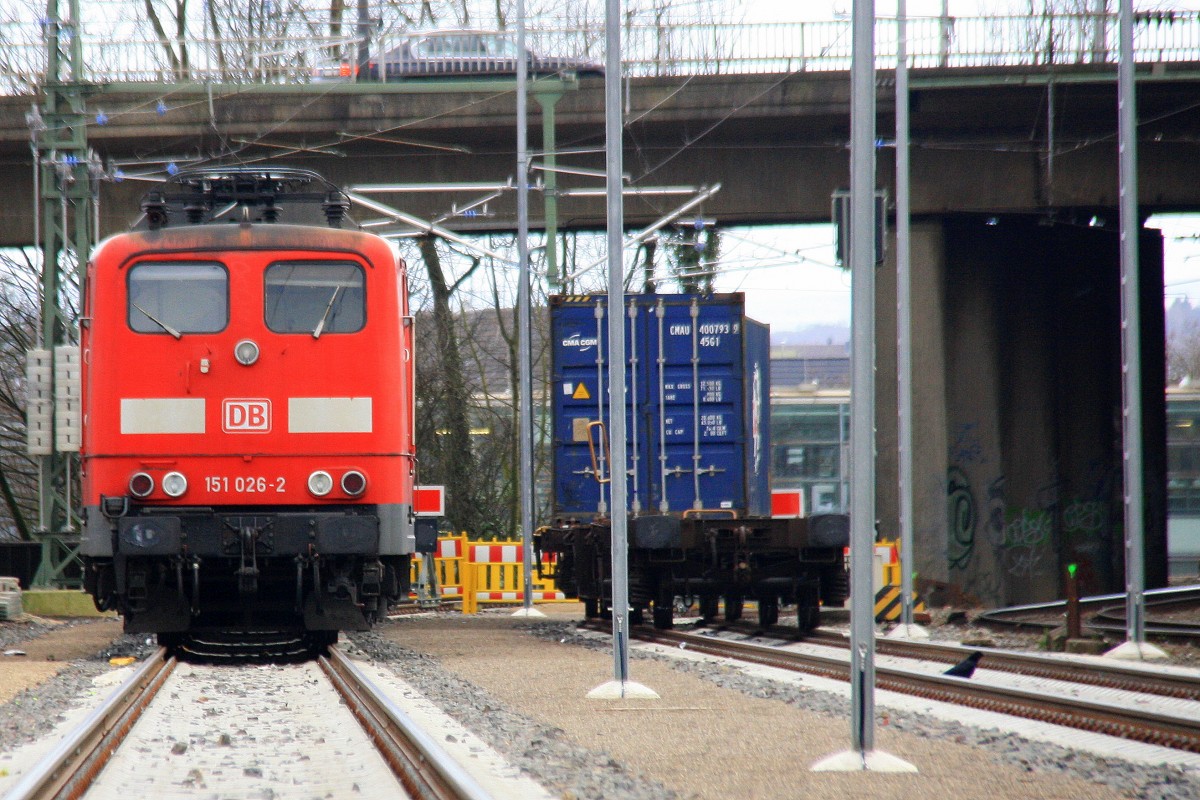 Durchfahrt von DB Schenker 145 059-2 mit einem langen Containerzug aus Richtung Norden über Gleis 1 in Basel Bad Bf gen Muttenz. (11.02.2014)