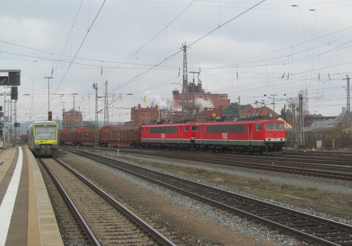 139 558 von Railadventure zieht am 11. Februar 2014 drei Güterwagen durch Kronach in Richtung Lichtenfels.