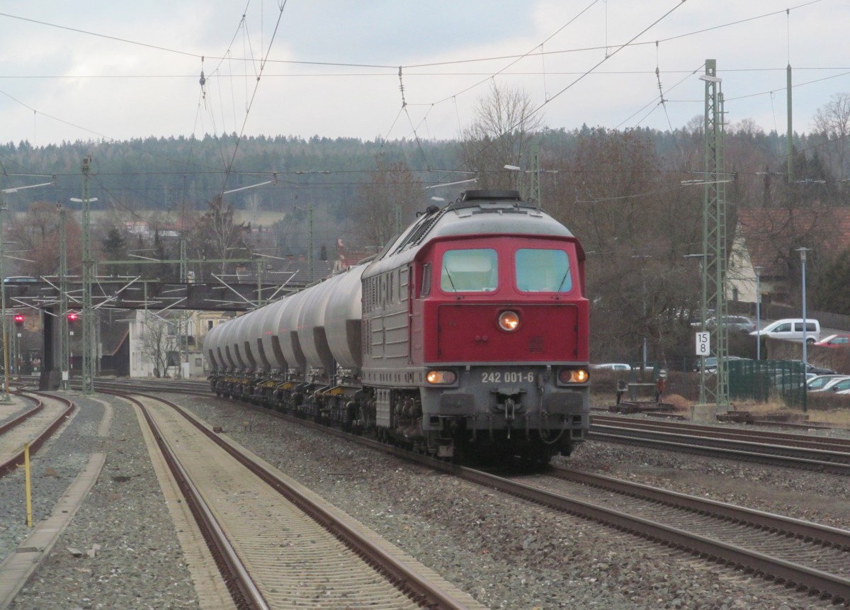242 001-6 von EKO Trans zieht am 12. Februar 2014 einen Staubzug durch Kronach in Richtung Lichtenfels.