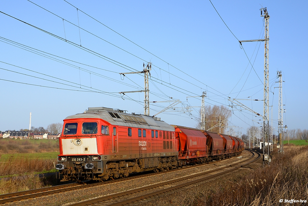 Aufgrund von Bauarbeiten in Bad Kleinen wurde im November/Dezember der Güterverkehr Zwischen Rostock und Wismar über Bad Doberan umgeleitet. Hier zu sehen die 232 283 in Rieckdahl auf dem Weg nach Wismar. 28.11.13