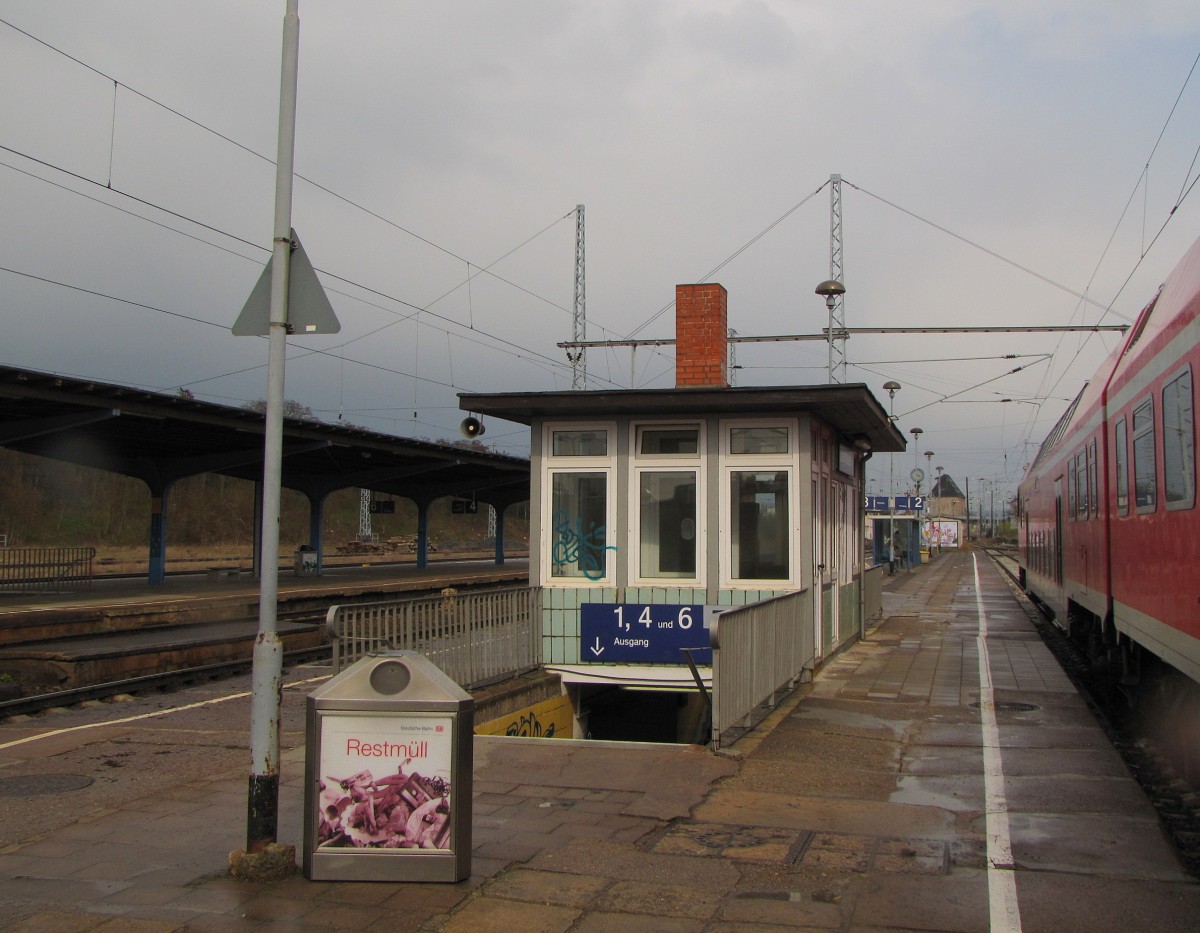 Das ehemalige Gebäude der Bahnsteigaufsicht auf dem Bahnsteig 2 und 3, am 12.04.2012 in Sangerhausen.