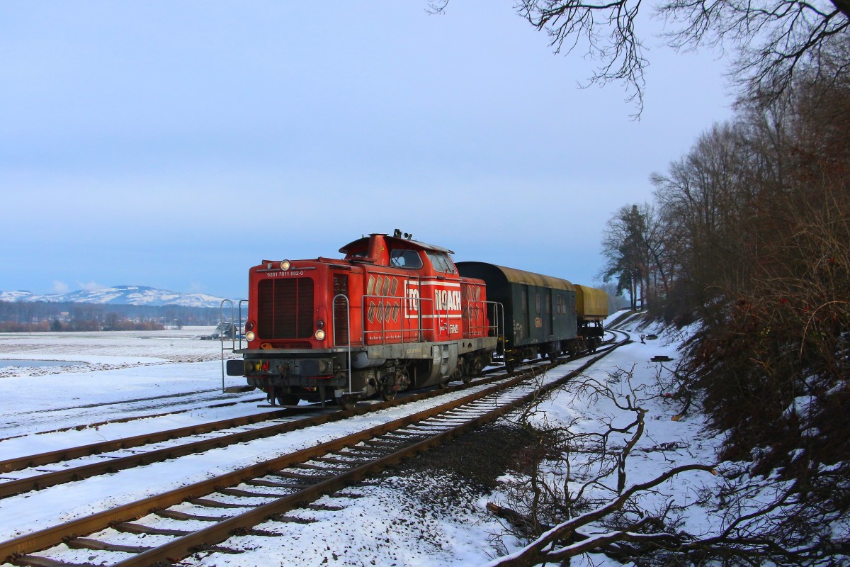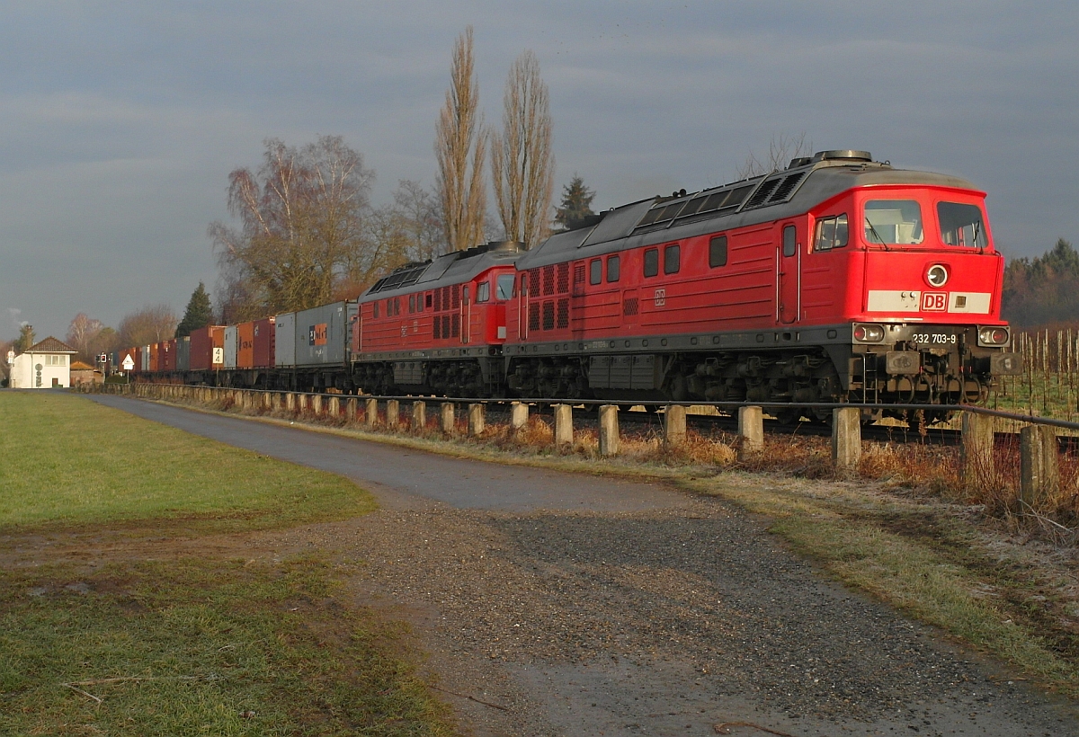 Zwischen Friedrichshafen und Eriskirch ziehen 232 703-9 und 232 653-3 am Morgen des 25.01.2014 den von Maschen kommenden und in Ulm übernommenen Containerzug nach Lindau-Reutin. Dort wird ein ÖBB-Taurus den Zug übernehmen und zum Zielbahnhof Wolfurt ziehen.