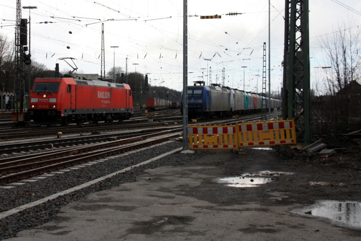 185 293-8 von Railion und eine unbekannte 185er DB fahren mit einem langen Ölzug aus Antwerpen-Petrol(B) nach Basel(CH) bei der Ausfahrt aus Aachen-West und fahren in Richtung Aachen-Hbf,Köln und auf dem Nebengleis eine 145 CL-204 von Crossrail steht mit 8 E-Loks von Crossrail stehen auf dem abstellgleis in Aachen-West am 16.2.2014.