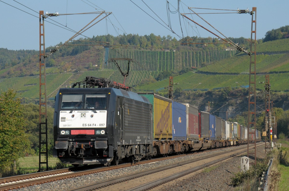 Hauptbahnhof aus. Zuglok ist die Mehrsystem Elektrolok "Mosel" 181214.
