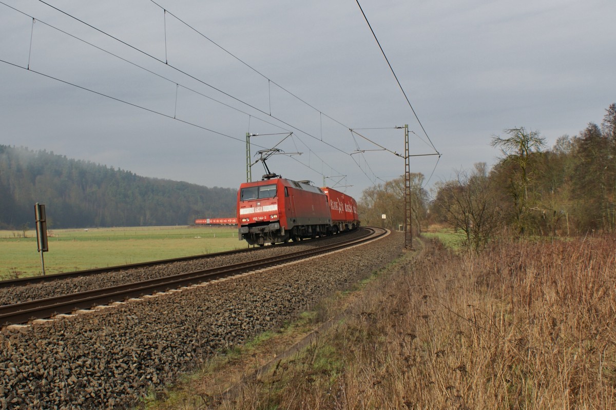 152 144-2 mit einen Containerzug Richtung Süden am 18.02.14 bei Hermannspiegel.