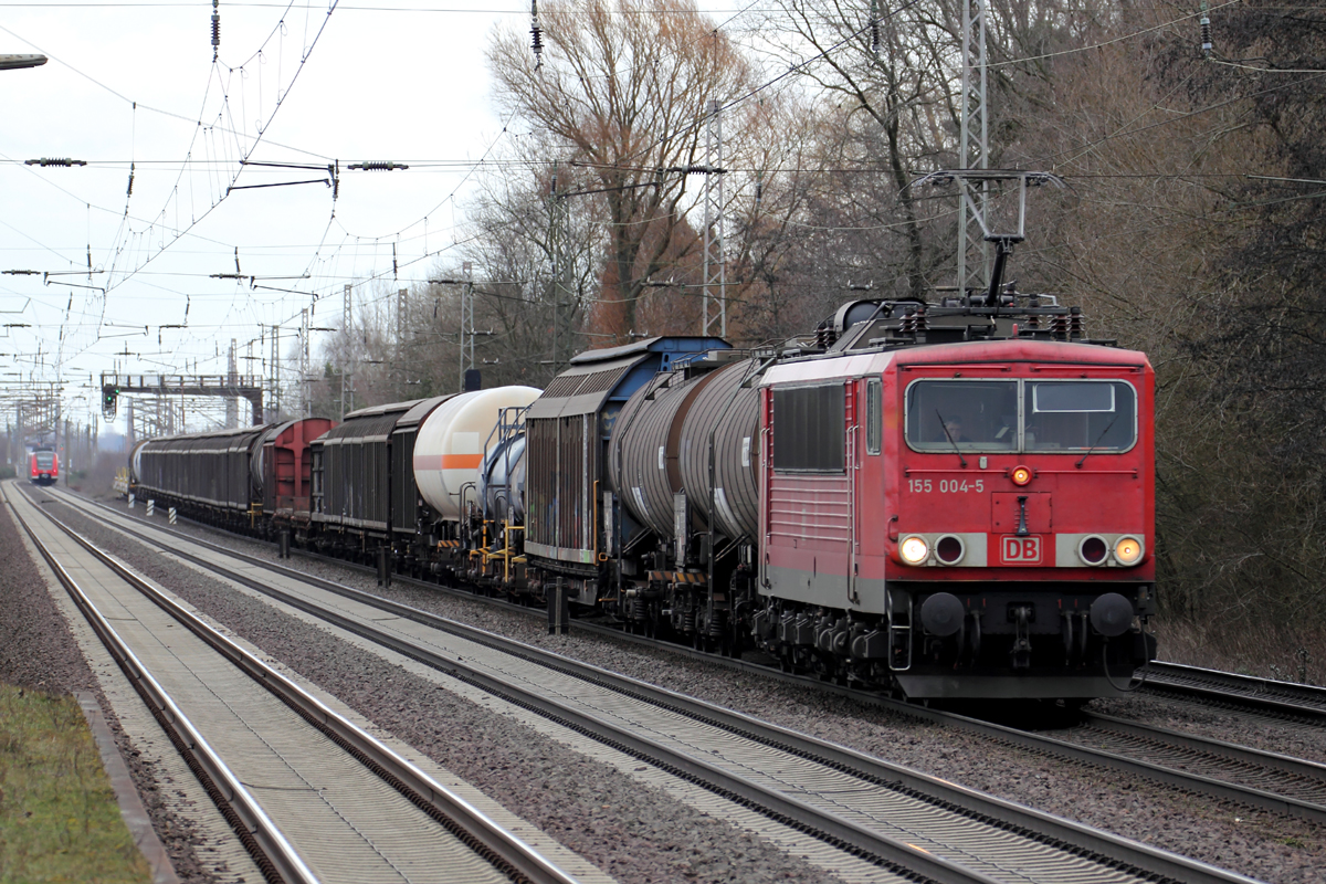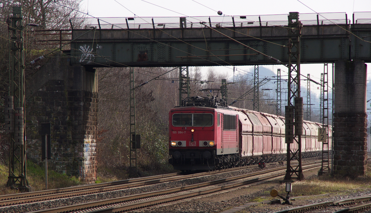 Kommissbrot mit Kalkzug nach Dillingen - 155 084-7 bringt den werktäglichen Kalkzug von Auersmacher zur Dillinger Hütte. Hier in Bous passiert der Zug das Gelände des Stahlwerkes Bous (früher Mannesmann Röhrenwerke). Eine Besonderheit ist noch zu erwähnen, der Lokführer der ehemals DDR Lok stammt auch aus den neuen Bundesländern. 18.02.2014 - Bahnstrecke 3230 Saarbrücken - Karthaus