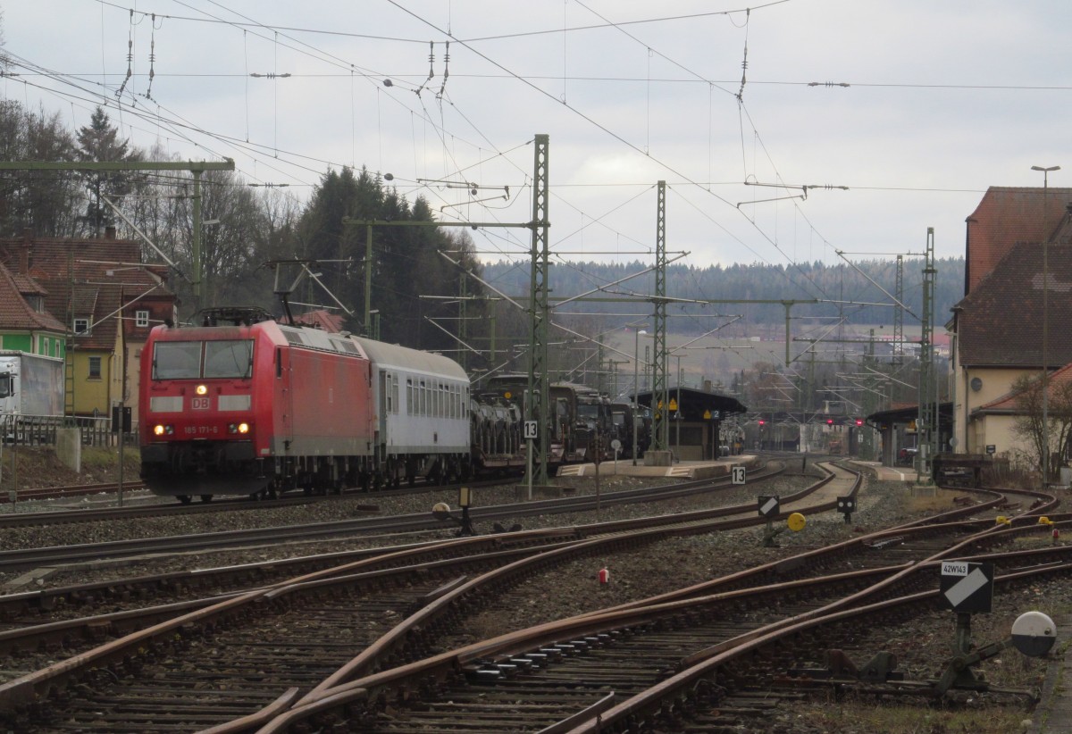 185 171-6 zieht am 12. Februar 2014 einen Militärzug durch Kronach in Richtung Lichtenfels.