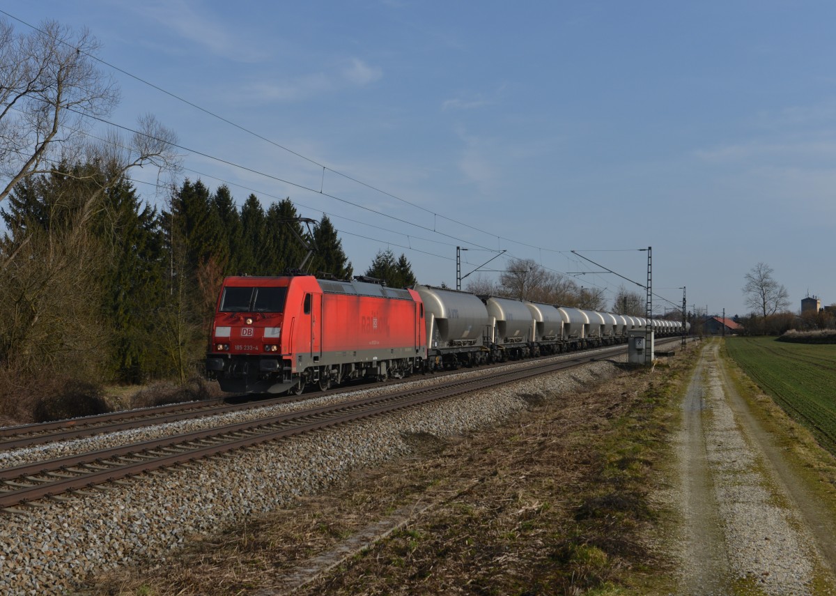 185 233 mit dem Silozug am 18.02.2014 bei Langenisarhofen.