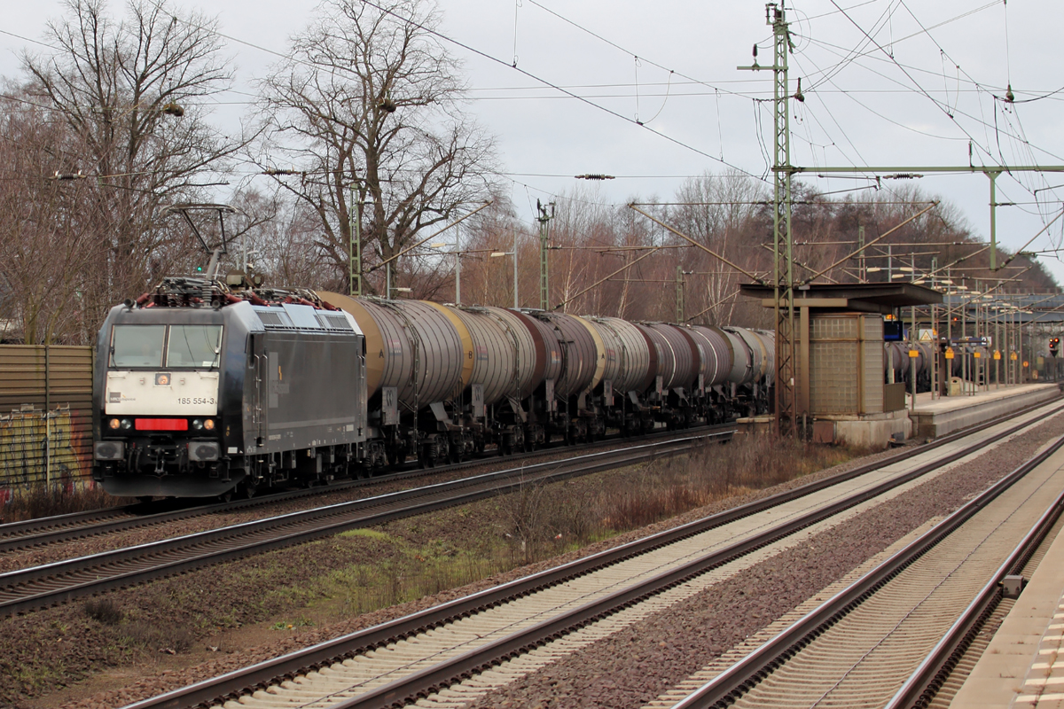Das kesselt oder grau in grau mit Farbtupfern - 185 148-4 bringt einen Kesselwagenzug durch das Saartal aus Richtung Saarbrücken. Hier in Bous ist die Landschaft noch sehr Industrie lastig geprägt. Erst hinter Dillingen wird sich die Landschaft an der Strecke ändern. Der ehemalige Bahnknoten Bous hat viel an Bedeutung verloren. Hier war früher sehr viel los. Direkt an den Bahnhof schließen sich die Rangieranlagen der Saarstahl an und das Gleisfeld der Stahlwerke Bous. Dort ist der Verkehr merklich zurückgegangen. Als die Mannesmann Röhrenwerke noch in voller Blüte standen war buntes Treiben auf den Gleisen angesagt. 18.02.2014 - Bahnstrecke 3230 Saarbrücken - Karthaus