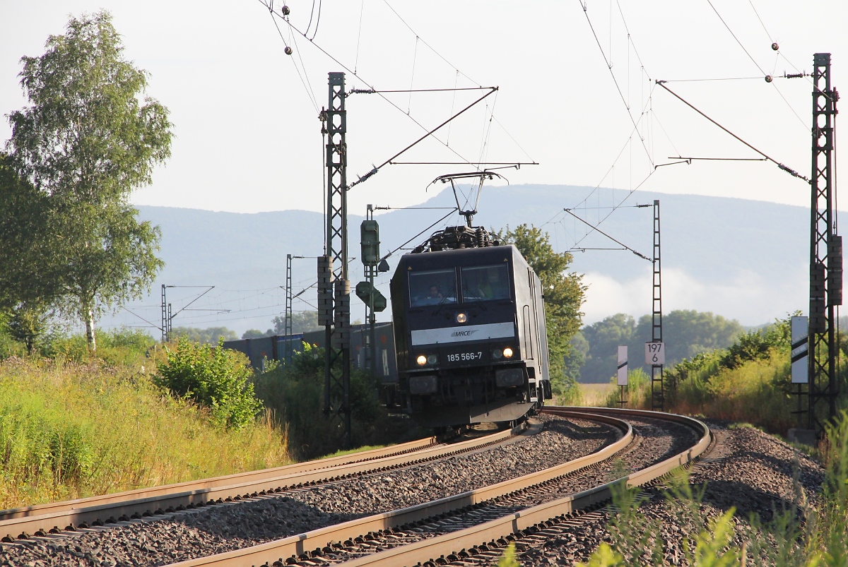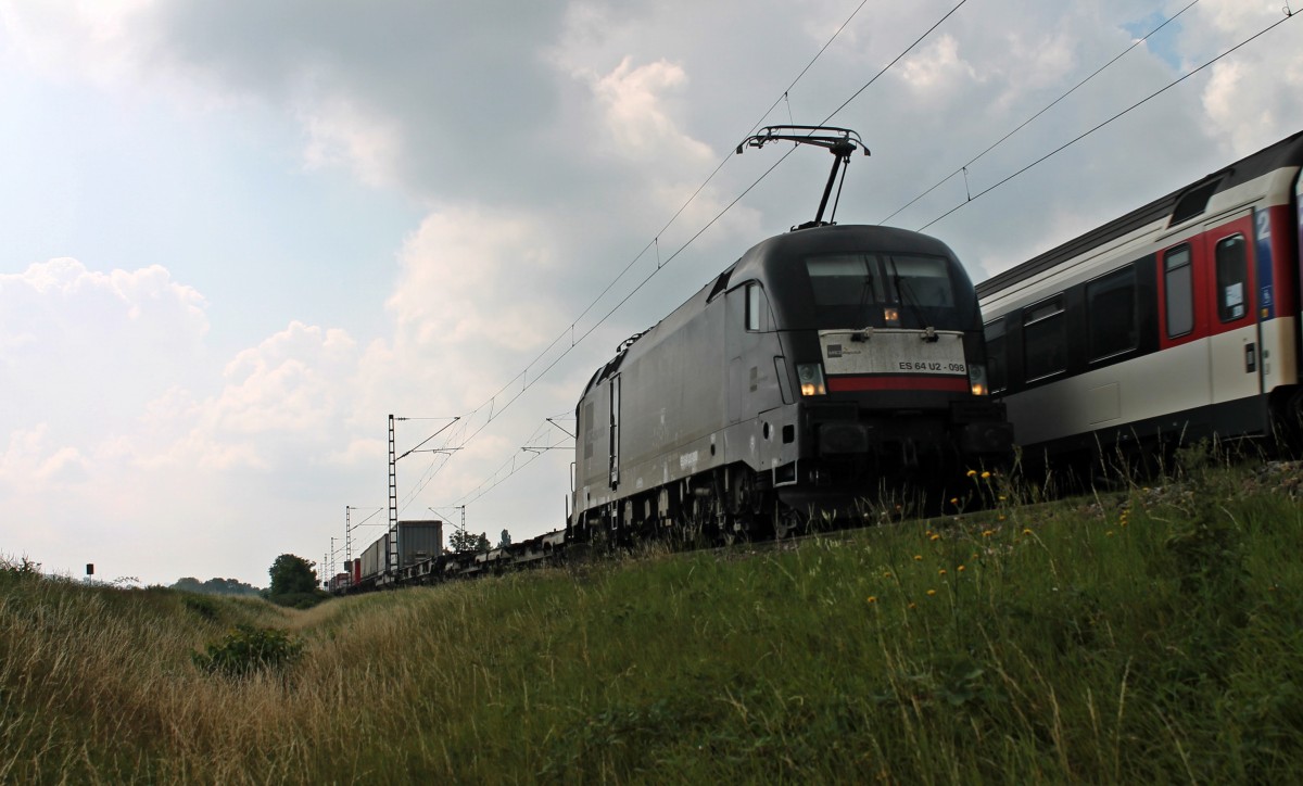 Am 28.08.2013 kam am Winzerort Hügelheim die MRCE/TX Logistik ES 64 U2-098 (182 598-3) mit einem fast leeren Containerzug aus Richtung Schweiz vorbei. Der Schweizer Wagen, am rechten Bildrand, ist der erste Waggon, des EC 9 (Hamburg-Altona - Chur HB), der an diesem Tag mit der 120 109-2 bespannt war und den Zug bis Basel SBB brachte.